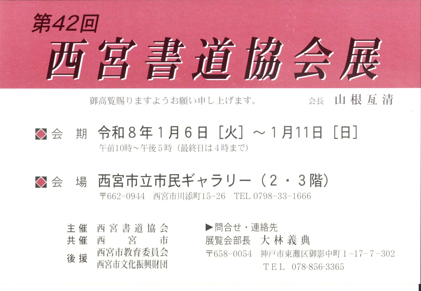 催しのご案内 第42回 西宮書道協会展 開催日時 会期:1/6(火)〜1/11(日)時間:10:00〜17:00(最終日は16:00まで)*入場無料 会場 第1・2・3・4展示室 主催 西宮書道協会 共催 西宮市 後援 西宮市教育委員会西宮市文化振興財団